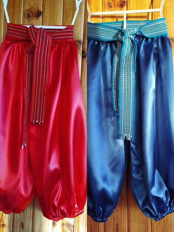 Тканина атлас. Цвет красный, синий. Производитель Украина. Размеры разные, уточняйте наличие. Дополнительно можно приобрести пояс (кроме) к шаровару, под его цвет. 185- 215грн Размер определяется по длине шаровар, от 30 см до желаемого размера. Замеряется от пояса до лодыжки на ноге +5 см на напуск. Размер 80-146 цена 290 грн Размер 146-170 цена 390 грн Наличие размеров уточняйте!