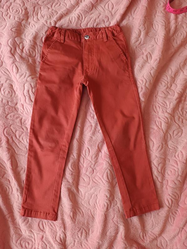 Яркие брюки для мальчика в очень хорошем состоянии, есть едва заметные потертости на коленях, на поясе есть резинка для регулировки полноты, карманы все рабочие