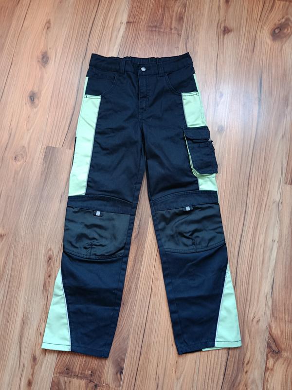 детские брюки бренда Kingcraft. Эти брюки выполнены в черно-лимонной (салатовой) цветовой гамме и предназначены для активного отдыха или в качестве рабочей одежды для детей. Характеристики изделия Бренд: Kingcraft. Тип: Функциональные рабочие брюки (карго) с накладными карманами. Материал: Обычно состоят из смеси хлопка и полиэстера (например, 65% полиэстер, 35% хлопок) для повышения износостойкости. Особенности: Светоотражающие элементы для безопасности в темное время суток. Регулируемый пояс с резинкой для комфортной посадки. Прочные вставки, иногда из материала CORDURA, в местах повышенного износа.(На коленях) Замеры Пот34 Длинна 89 Шаг 64 Посадка спереди 26 Посадка сзади 33 Состояние отличное