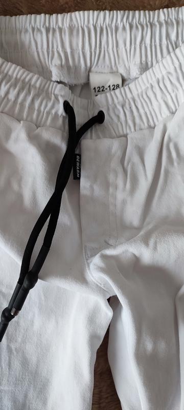 Белые джогеры украинского производителя материал плотный коттон не парит. На резинке, по бокам карманы. Размер 122-128 см. Они очень стильные и удобные, ребенку покупала на выпуск с садика, также есть белая рубашка воротник стоянец.