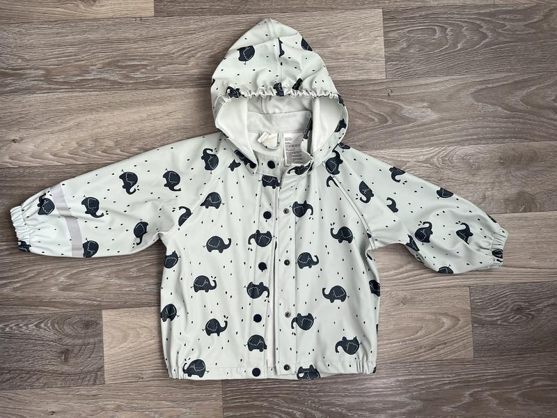 Куртка-дождевик 1/5-2 лет, из непродуваемого и водонепроницаемого функционального материала с герметичными швами и набивным рисунком. Съемный капюшон с резинкой по переднему краю. Кнопки спереди, а также резинка снизу на рукавах и по нижнему краю. Светоотражающая деталь. Без подкладки. Замеры: длина - 44см, ПОГ - 39 см, длина рукава от горловины - 39 см.