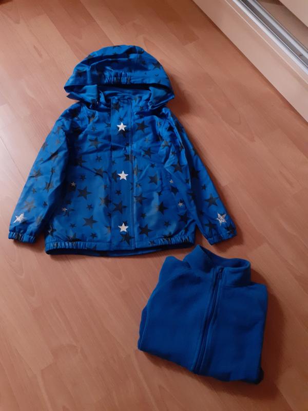 В целом, состояние хорошее, из нюансов звездочки, на которых нанесен светоотражатель, начинают слезать, на фото показала ( можно полностью счистить, что и сделала на передней планке). Курточка очень выручала в дождливую ветреную погоду, утеплена нежным микрофлисом. В подарок флиска.