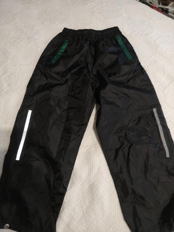 дождевые брюки размер 122-128,новые п.о.т.26 тянутся к 38-40 см, длина 79 см, посадка 26/34 см,в поясе на резинке и шнурке, по низу кнопки на две позиции, ширина ночника 20 см, светоотражающие поломки сзади и по бокам