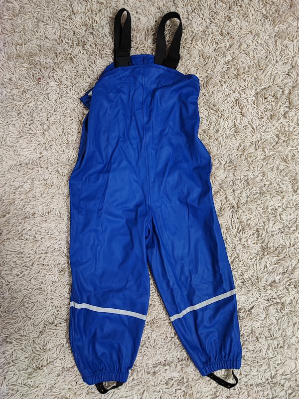 Ярко синий дождевой комбинезон. На 120- 128 см. Регулируется резинками на плечках и снизу регулируются лямки брюк для фиксации ноги. Под руками есть кнопки для регулировки объема/обхвата ребенка. Непромокаемый и водостойкий. PV/ полиэстер. С подкладкой из коттона. Со светоотражающими полосами на ногах. Ширина 37 см. Внутренний шаг 37 см. Общая длина комбинезона 71 см.