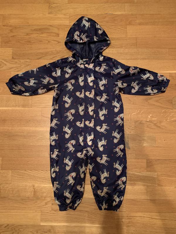 Комбинезон непромокайка дождевик грязепруф Nutmeg на 1,5-2 года, полностью весь на подкладке сеточке. Замеры: ПОГ- 36, длина от плеча- 76, длина от плеча до паха-51, шаговый шов-27, рукав от ворота 38.