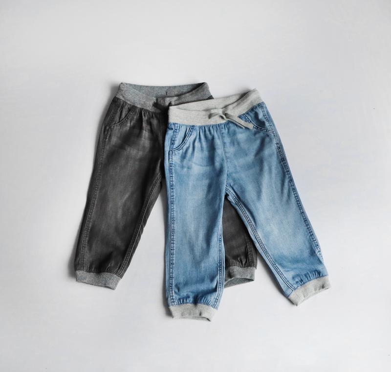 Джогери H&M р.98, р.104, літні, з мякої тонкої бавовни. Рельєфна трикотажна резинка і кулиска на талії, а також помилкові кишені спереду. Вільна посадка і злегка завужені донизу штанини з рельєфною трикотажною резинкою. Сток, нові, без паперової бірки. В навяності в двох кольорах голубий денім, чорний денім. Розмір 98: довжина 53 см, кроковий 33 см, пояс 25 см. Розмір 104: довжина 56 см, кроковий 36 см, пояс 26 см.