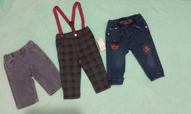 Штанишки для мальчика. 1. Джисни в хорошем состоянии на 3-6мес. 80 грн. 2. В клетку на подтяжках,новые, 6-9мес. 120грн. 3. Джинсы новые, на 1 год. 130 грн.