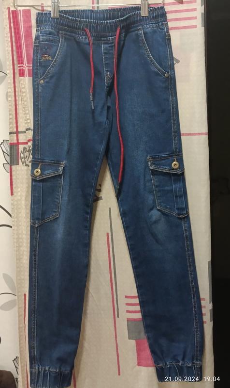 Брюки джинсовые детские. Состояние очень хорошее. Потертостей нет. Длина от пояса до манжетов 80 см.