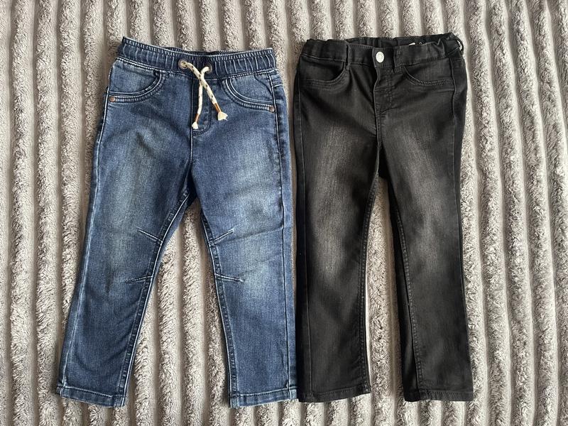 Джинсы синие и черные идеального состояния для мальчика. Синие пояс на шнурках, черные пояс регулируется внутри. Размер 2-3 р.