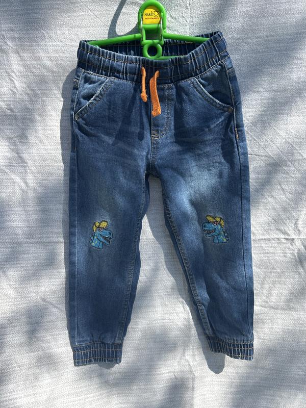 Стильні джинси для хлопчика з нашивками динозаврів у ідеальному стані, на резинці з додатковим шнурком, штанки теж на манжетах з резинкою, всі кишені робочі ) Якісний пошив, джинс тонкий та легко тягнеться