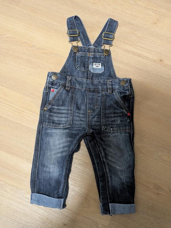 9-12 мес., согласно бирки. Большемерит.Ориентируйтесь по замерам, пожалуйста Удобно надевать за счет кнопочек на талии,такое есть кнопки в пахе для удобной замены подгузника. можно регулировать высоту лямок и комбинезон "растет" вместе с малышкой. Замеры: длина 63 см.( с лямками на положении на фото) 52 см.(без лямок) шаговый 25 см. ширина в бедрах 29 см.