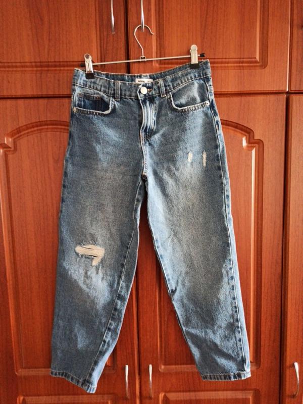 Джинсы с потертостями новые,р.140. На поясе есть резинка можно стянуть по талии. Посадка средняя. Длина 80см, талия 34см,стегна 41см. Джинсы качественные ткань плотная.