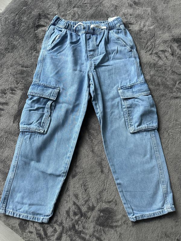 Класні джинси в гарному блакитному кольорі, на талії резинка та шнурок, довжина 76 см талія 28