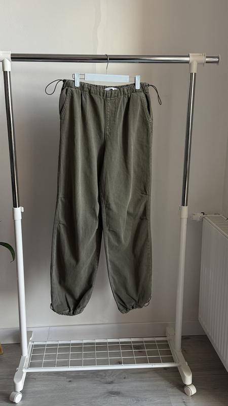 Женские брюки карго, на резинке снизу и на талии, из джинсового материала, цвета хаки. Размер м38, регулируется за счет резинки на талии и оверсайз кроя