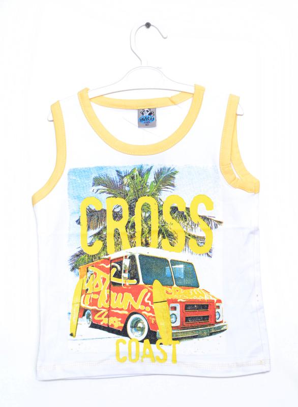 Майка мальчик Легкая летняя майка для мальчика. Украшена рисунком на груди. Выполнена из тонкого трикотажа. Состав: 100% хлопок Цвет: белый Размер 90, 104, 110, 116, 122