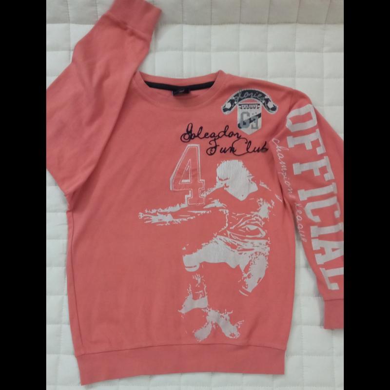 футболка с плотной ткани.типа кофточки....коралловый цвет.правильной формы и цвета есть спереди малозаметные пятнышки но не каждый это заметит..что вижу то и пишу.принт скейт бордист.черное вышито нитками низ и рукава резинки трикотажные.ткань хлопок-98% и эластан-8% отшито в Турции .