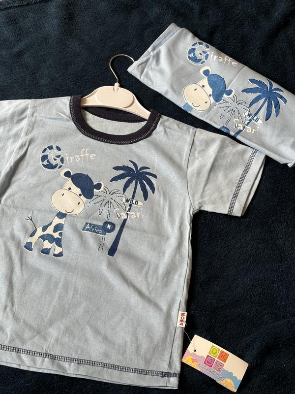 Голубая футболка с жирафом на мальчика. В наличии 2 размера: на мальчика 104см ростом (4 года) и 110см ростом(5 лет). Бавовна 100% Производитель Украина