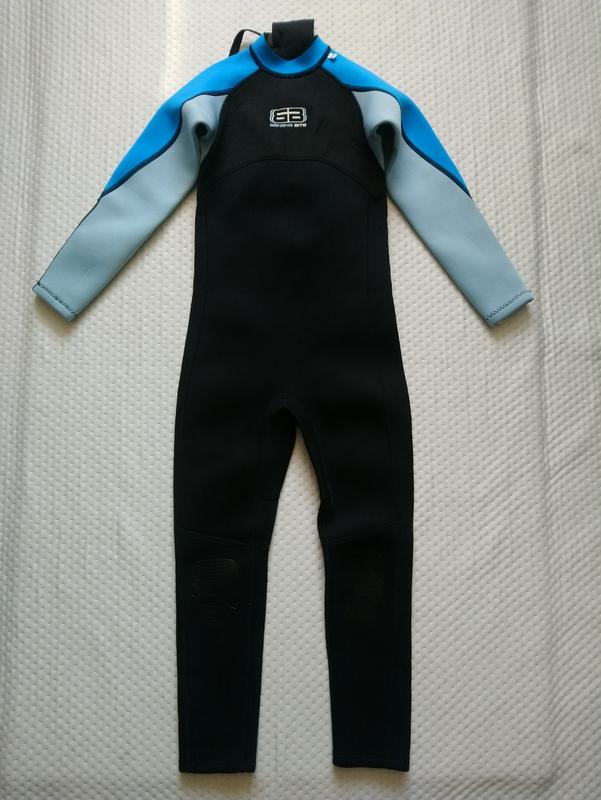 В дуже хорошому стані. З дефектів пішли невеликі стрілочки. На вік 10-11 років. Товщина неопрену 2,5 мм. Висота від плеча до низу 108 см, до паха 61 см. Від горловини до паха 56 см. Під руками 32 см. Півобсяг пояса 30 см, бедер 35 см. Рукав від шиї 52 см