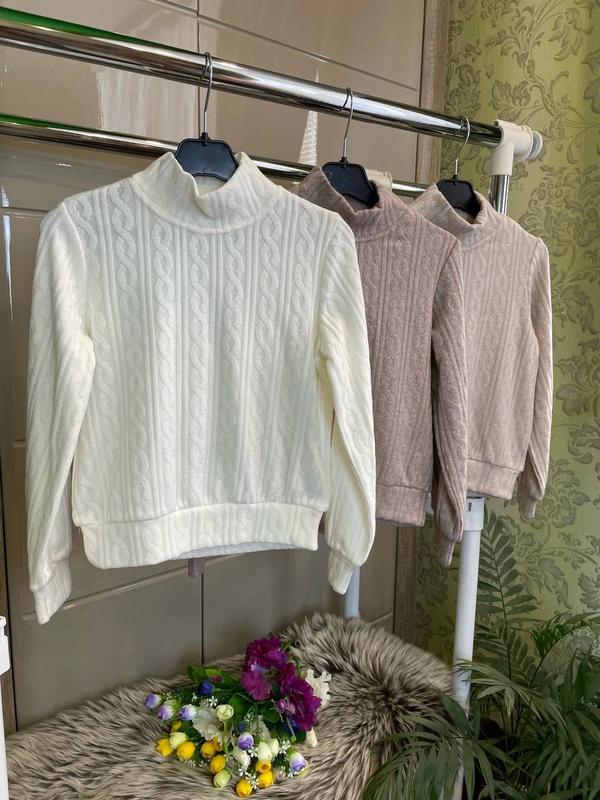 Стильний теплий гольфик для красунь, тканина ангора косичка приятная к телу не колется цвет молочный Замеры: длина/пог/рукав от плеча 128 - 43/36/45 134 - 45/38/47 140 - 46/39/51 146 - 49/40/53