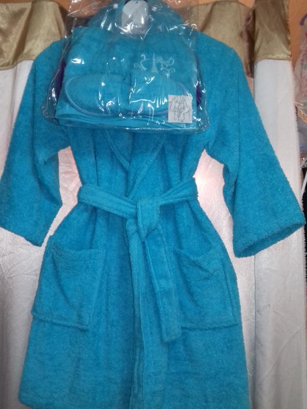 Комплект из махры(коттон 100%) халат+шлепанцы+полотенце. Турция. Цвет голубо-бирюзовый. На 5-7 лет.