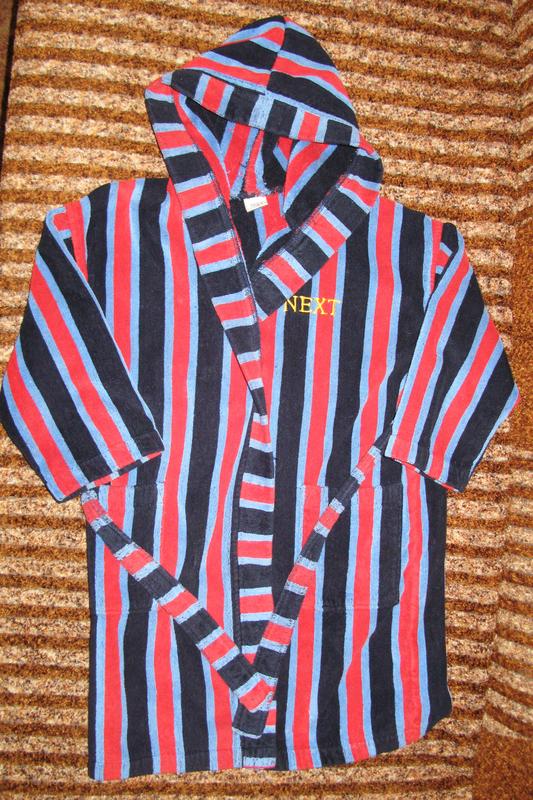 Махровый халат Next р. 116 (большемерит). Пятен, дырок нет. Очень хорошо впитывает влагу. Внутри на махре есть зацепки. Длина 70см, ширина по груди 46см. рукав от подмышки 30см, от плеча 32,5см, плечо 17см