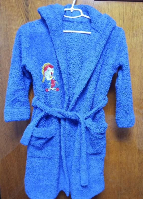 Красивый махровый халат. Подойдет и мальчику и девочке, состояние красивое, с нюансов - чуточку скатанные или затертые рукава( не знаю как описать - махра не торчит, а более гладкая. Возможно как-то поднимается- не пробовала). Цвет насыщенный синий, красивый. Длина - 80 плечі- 38 Рукав - 41 Какой размер не написано, смотрите замеры