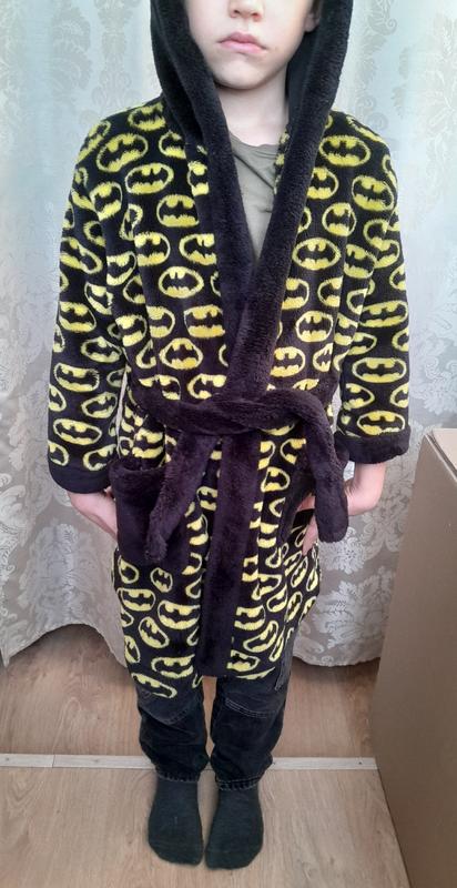 Очень красивый халатик,флисовый,тематический "BETMAN".Размер 5-6 лет.Воспоминаемым на вопрос,онадам замеры по необходимости.Колир насыщенный, на фото немного засветлен.