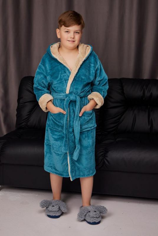 Халат для хлопчика махровий теплий тканина поліестр, 100% синтетична ворсиста тканина ворс двосторонній, м'який, приємний до тіла. Підходить на 6/8, 8/10, 10/12 років Виміри у табличці. Ширина халата повинна бути більшою за обхват людини на 20см і більше