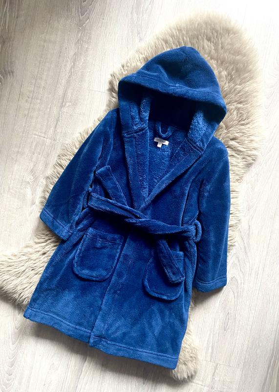 Детский халат английского бренда Bluezoo с капюшоном, указанный возраст 4-5 лет. рост 110 см. Замеры: общая длина - 63 см, длина рукава от плечевого шва - 35 см, ширина под ручками по спинке - 38 см. Вшитый пояс, не потеряется и не будет сползать. Вместительный капюшон. Шикарное английское качество, плотный и теплый. Состояние идеальное.