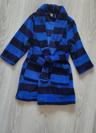 мякенький халатик для хлопчика, синій в смужку. без капюшону. дуже зручний !! ззаду резиночка , а пояс пришитий до халати, що дуже практично . по бірці 3-4роки. але я б з 2 років сміливо брала. 60 см довжина