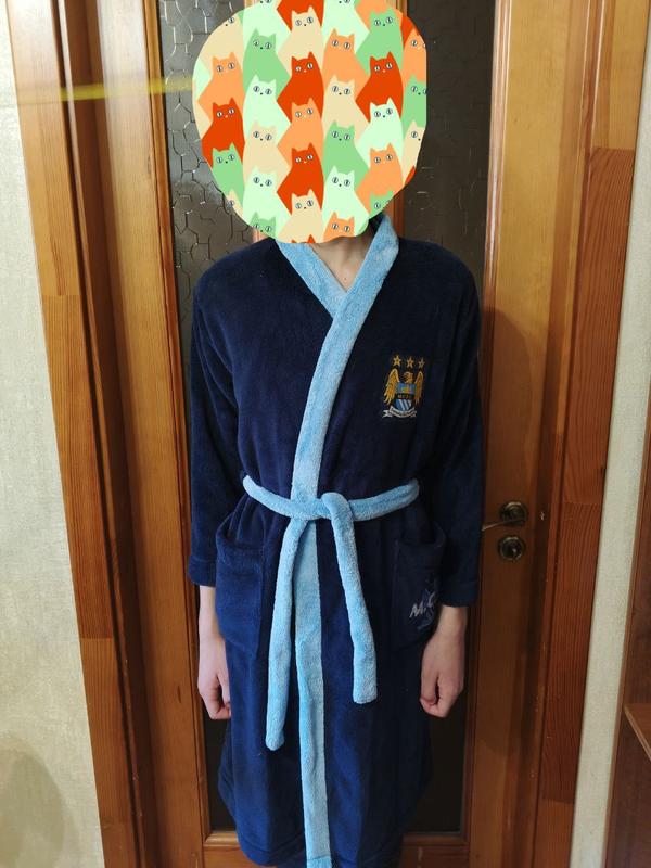 Халат в идеальном состоянии, получили в подарок, но оказался - слишком мал. Возраст- 11 - 12 лет на рост 150 см. Можно надевать после ванны и просто так. Теплый и приятный на ощупь. Интересный логотип футбольной команды.