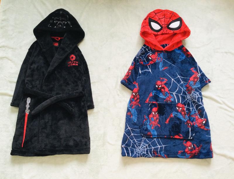 5-6 рок. Marks & Spencer флисовый, махровый, пушистый халат. теплый, банный, на море или в бассейн. один завязывается на талии пояском. второй Халат - худи. есть Карманы. Халат на поясе Star War длина 72; рукав от ворот 58 Халат - худи Человек-Паук длина 70; пог 52; рукав от ворот укороченный 29 по 399 грн