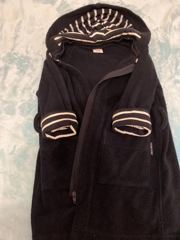 Очень удобный и комфортный халат темно синего цвета на змейке, рукава с отворотом, состояние идеальное. Капюшон отстегивается. Подойдёт как для мальчика так и для девочки