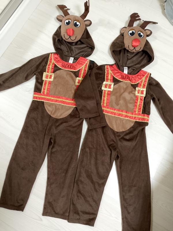 Карнавальный плюшевый костюм / комбинезон олень. Цвет коричневый с красным, золотистым и др. Размер указан 5-6 лет/ 110-116 см. Линия груди 37 см. Линия талии 34 см. Длина от плеча 95 см. Шаговый шов 45 см. Плечи 30 см. Длина рукава 41 см. Застежка сбоку и на плече - липучки. В наличии 1 шт.