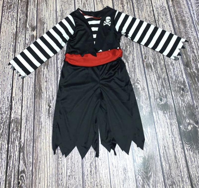 костюм пирата. идет как комбинезон. на спинке зашита стрелка у застежки. Практически не видно, на один раз надеть подойдет. костюм скелета на хеловин или какую-то тематическую вечеринку.
