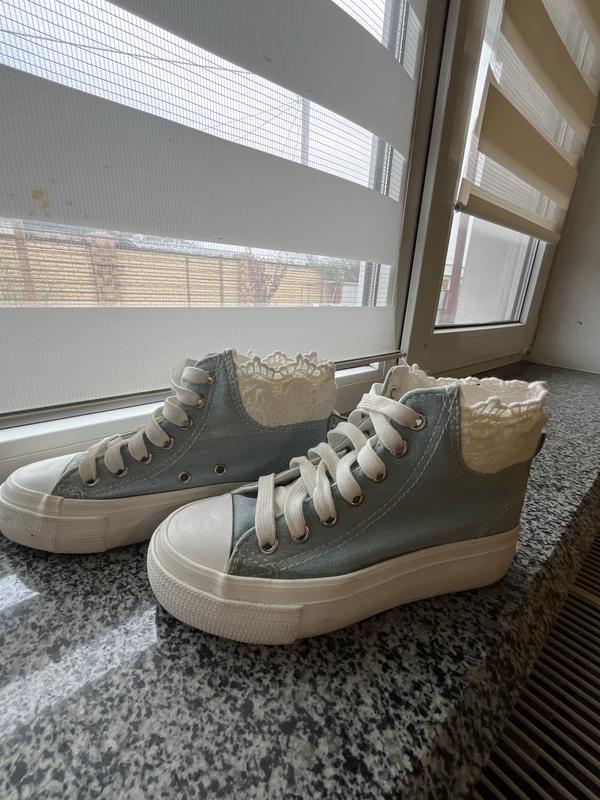 Джинсовые высокие кеды на толстой подошве, пятка обшита кружевом, очень оригинальные и добавляют шарма. Длина стельки -22см
