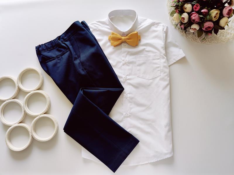 Сток. Продается без бабочки. Брюки темно синие. Верх: Плечі , см. 38,5 Низ: НОТ\ тягнеться , см. 33-35 Низ: НОС\ тягнеться , см. 40 Низ: Довжина , см. 86 Низ: крок , см. 64,5 Верх: НОГ , см. 46 Верх: НОГ , см. 45 Верх: Длина, см. 59
