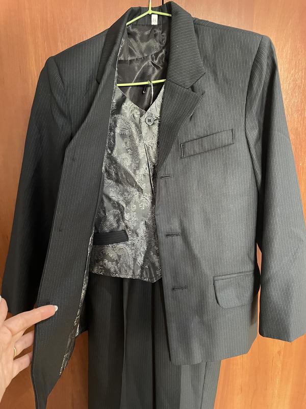 Дорога качественная комтюмная ткань, покупали в специализированном магазине. состоит из трех вещей: брюки, пиджак и жилет. замеры: Пиджак длина 60, рукав 50, под мышками 41. Штани длина 80( + 5 еще запас), пошаг 58+5., талия 29*2 Жилет 45 перед, 42 по спине, бд мышк 35*2 Цвет черный. пише на бірціі 34