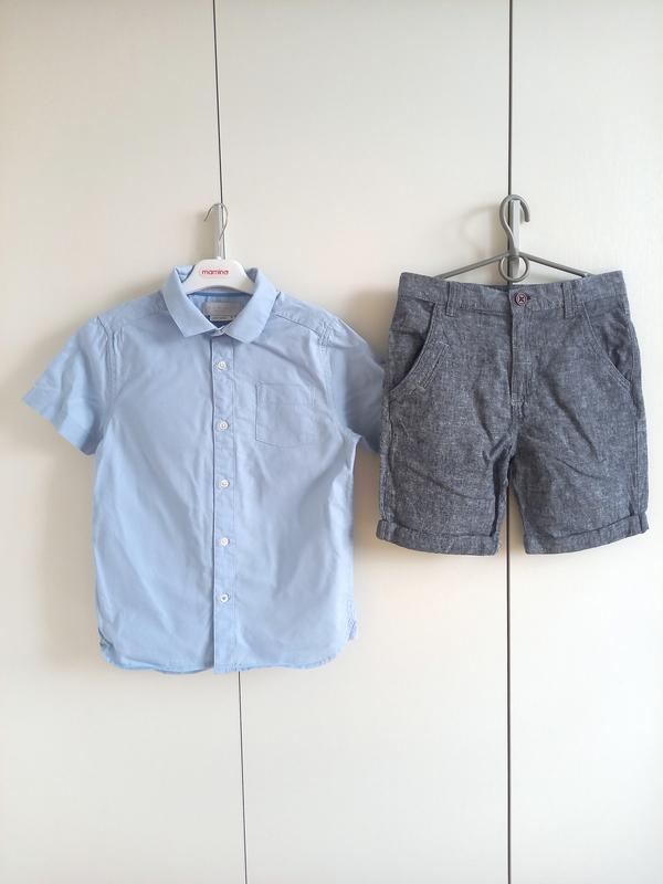 Набор костюм нарядный летний на выпускной для мальчика: Качественная фирменная рубашка летняя голубая с коротким рукавом John Levis для мальчика 9 лет ростом 134 Длина - 58, ПОБ - 42. Бавовна. Модные коттоновые классические джинсовые шорты для мальчика 8-9 лет ростом 128-134 Длина по боковому шву - 38, пояс - 33 (шнурок и резинка), ПОБ - 39,5, ширина штанины - 19. 55% льон, 45% бавовна. Тонкие, немного тянутся. Состояние отлично как новые. Смотрите все мое объявления.
