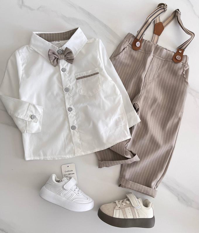 Дуже стильний та якісний костюмчик для ваших джентельменів Метелик і підтяжки в комплекті Якість на всі 100% Штанці на резинці ,мають кишеньки, сорочка коттон Розміри в наявності: Довжина штанів/ крок/ ширина/ максимальна ширина/ сорочка довжина/ ширина/рукав 9/12міс- 46/ 28/ 21/ 27/ 33/ 32/ 28.5 1/2роки- 52.5/ 33.5/ 21.5/ 28.5/ 36/ 33/ 31.5 3/4роки- 59/37.5/22/29.5/38/34.5/34.5 4/5років-65.5/44/23/32.5/42.5/35.5/38 5/6років-72/51/25/33.5/45/39/42 7/8років-78.5/55.5/27/37/49/41.5/44.5
