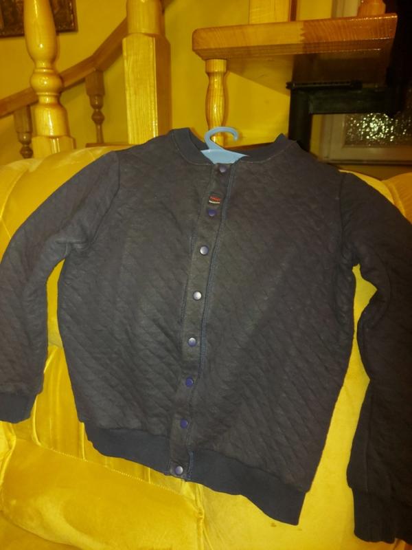 Кофтинка фірми Gabbi темно-синього кольору , застібається на кнопочки синього кольору. Зроблено як бомбер, рукава мають манжет, низ теж на манжеті. Підкладу немає, але вона не тоненька, не кошлатиться - якісна. Підійде на ріст 128-134 см. Заміри ПОг - 39 см, довжина рукава - 44 см, довжина виробу - 45 см.