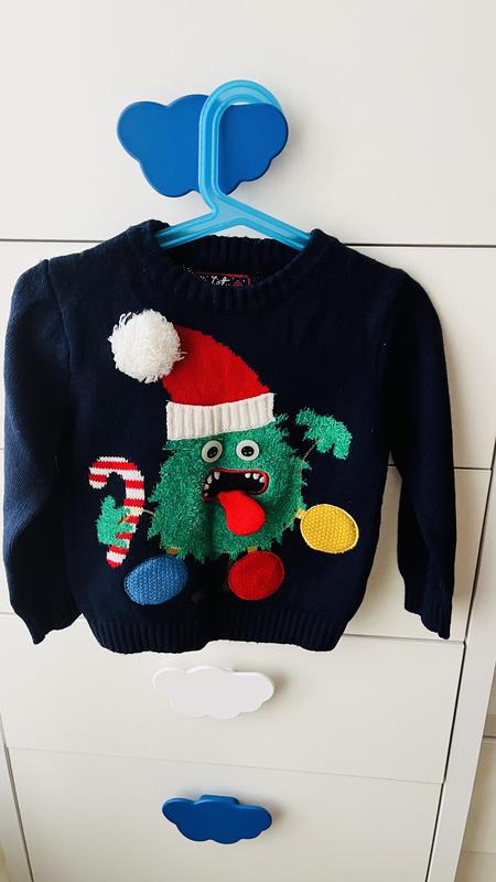 Продам прикольный новогодний свитерок на 2-4 года. Глаза-пуговички. Внизу красный кружочек мигает при нажатии.