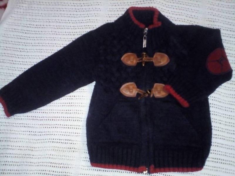 Свитер для мальчика. В хорошем состоянии. На молнии и двух пуговицах. Темно синий. Размер указан 0-1год. Но мы носили до двух лет. Впереди два кармана. Замеры: от подмышки до подмышки -26см, плечи -5см, рукав -25см длина по спинке 33см.