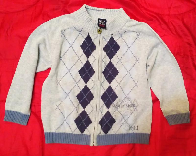 Кофта Next 100% хлопок , размер написан 3-4 года (104см), носили до 122см), дефектов нет, только накатка внизу слева от стирок немного поблекла, немного манжетики растянулись. Длина 45см, ширина 44см, рукав от подмышки 28см, от воротника 47см Цена 40грн