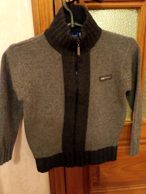 Кофта серого цвета, застегивается на молнию. Длина рукава ( от плеча вниз) – 40 см, ширина спины ( от плеча до плеча) – 37 см, длина изделия – 48 см.