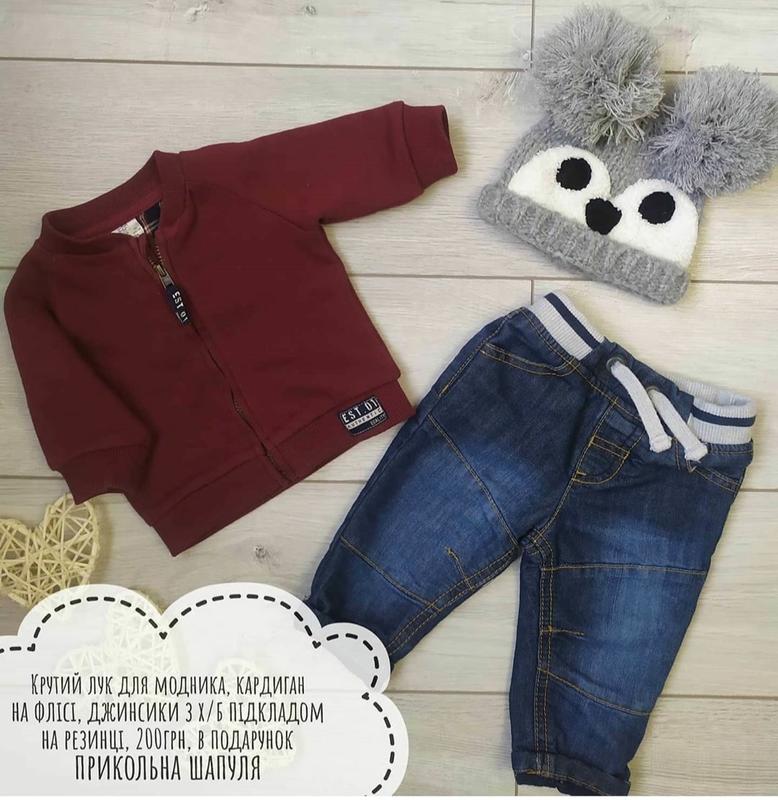крутий лук для модника, на 0-4місяці , кардигани на флісі, джинсики з х/б підкладом, пояс на резинці, в подарунок прикольна шапуля