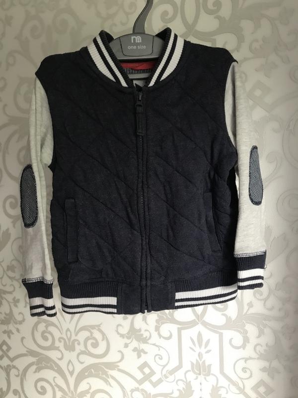 Кофта бомбер Next. Стеганная спереди с сзади по текстуре- двойной хлопок. На локотках нашивки. Застегивается на молнию. Воротник стоечка. На горловине, внизу на рукавах и по низу кофты-широкая резинка. Спереди прорезные карманы. Замеры: Пог-36 Длина- 41 см Длина рукава от линии плеча-34 см