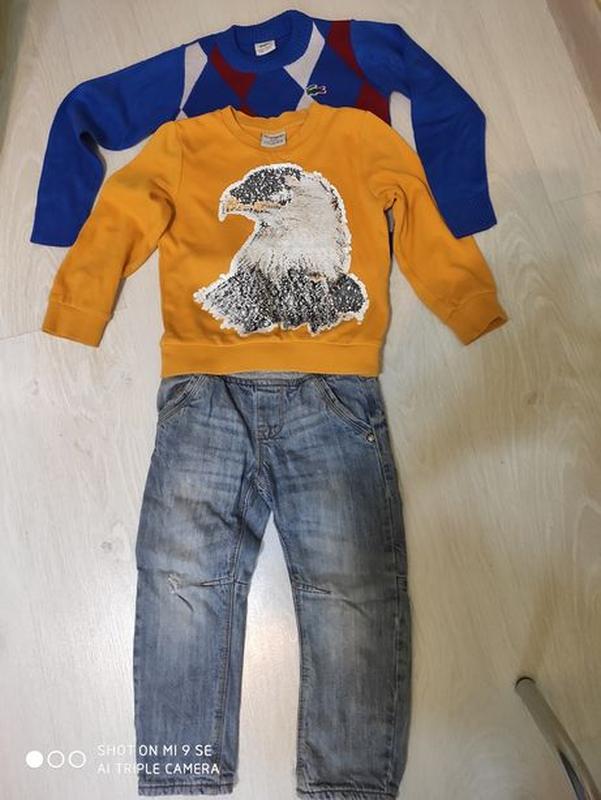 Набор состоит из 3 фирменных вещей (не секонд) Джинсы на резинке с х/б подкладкой (на коленке потёртость) длина- 54 см, ширина 31 см, шаг 37см. Жёлтый свитер переливашка длина - 39 см, ширина 33 см, рукав-36 см Синий свитер длина 39 см, ширна 31 см, рукав рукав 40 см