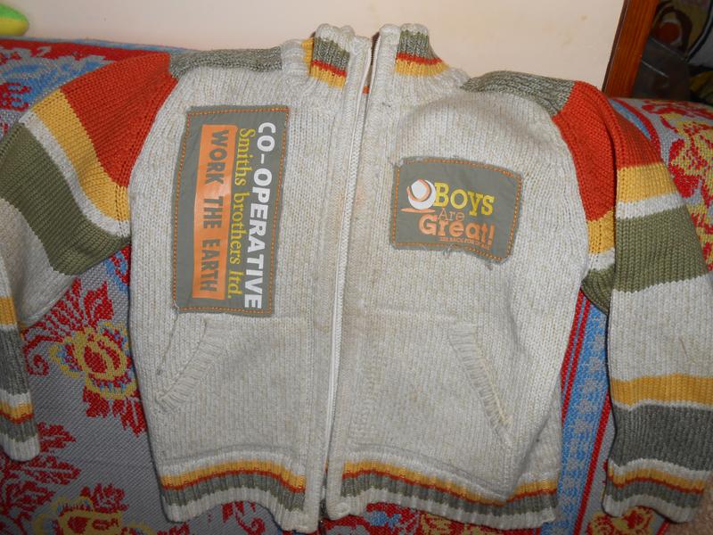 кофта на замку, ширина плечей - 32 см, довжина рукава - 43 см, ширина - 41 см, довжина кофти - 48 см. Воротнік - стійка, є два кармани,невеличка плямка.