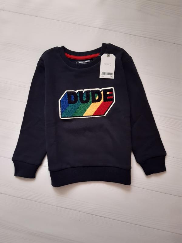 Теплый тёмно-синий свитшот next с ярким принтом на 3-4 года, рост 104см.Внутри начёс. Длина 43см, ПОГ 34см, рукав 37см